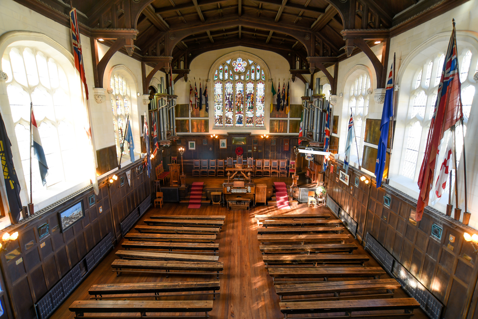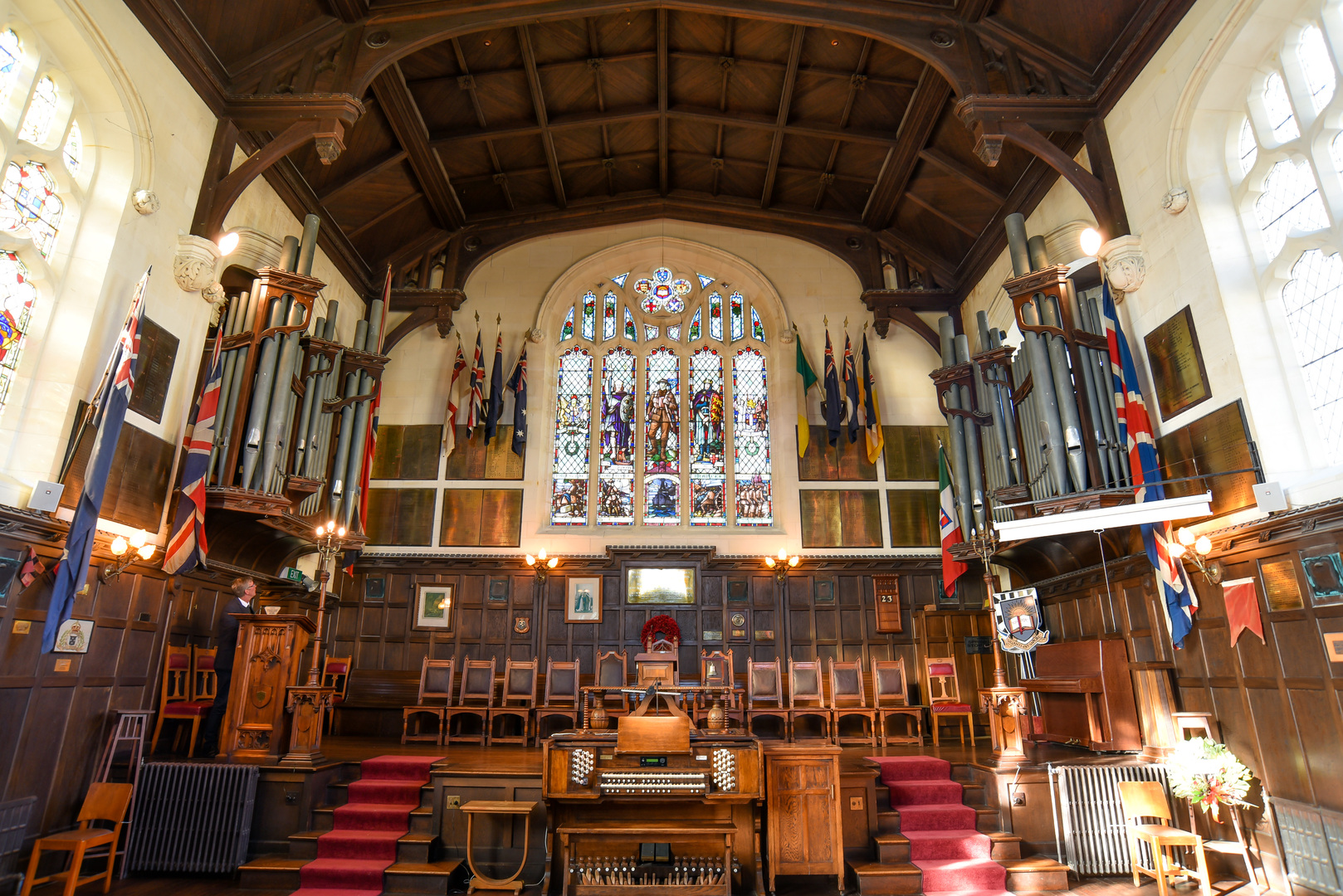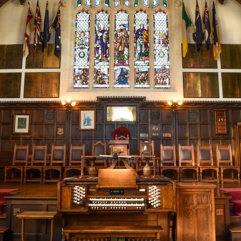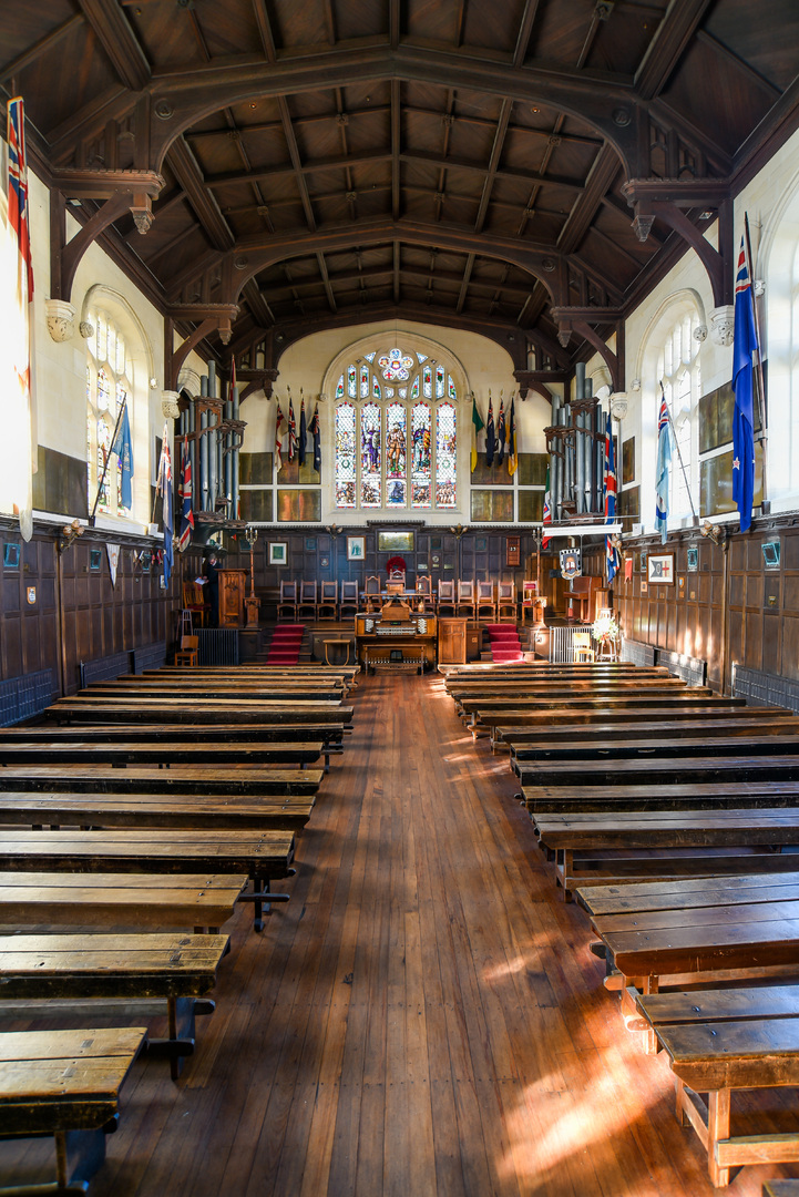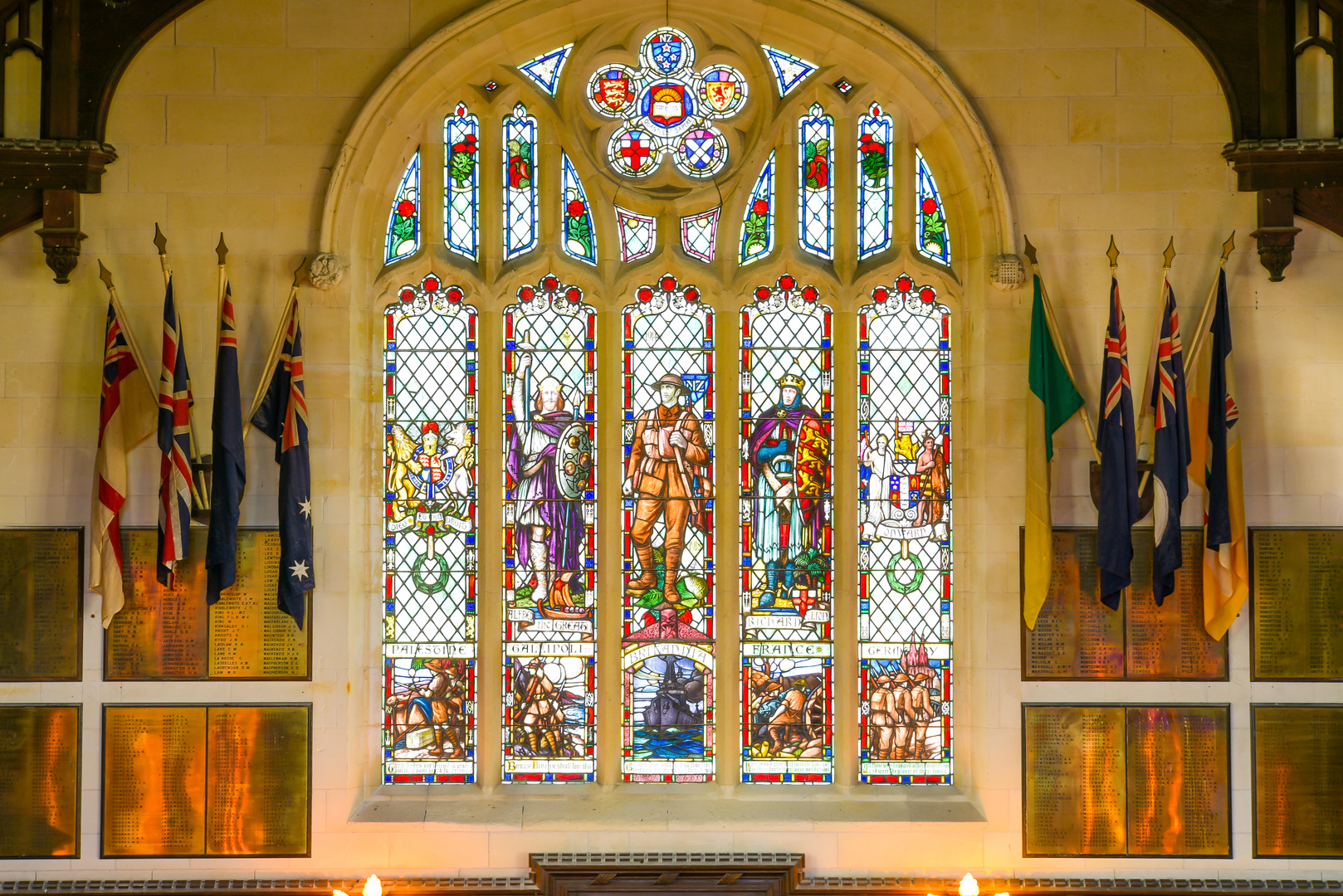 Like many other communities, World War One had a profound impact on the Waitaki Boys’ High School community. Around 700 old boys served during the First World War and 119 of them died. Rector Frank Milner believed that a hall, in the style of such buildings associated with English Public Schools, would be a fitting memorial. In 1920, a building committee launched a fundraising appeal. Governor-General Jellicoe laid the foundation stone in 1923 and the Duke of York performed the official opening ceremony on 16 March 1927. The building has memorial stained glass windows and a collection of memorabilia, including flags, trophies and plaques, emphasising the school’s significant associations. When Governor General Lord Jellicoe laid the foundation stone, he spoke of the importance of memorials as instilling pride in school, country and Empire.